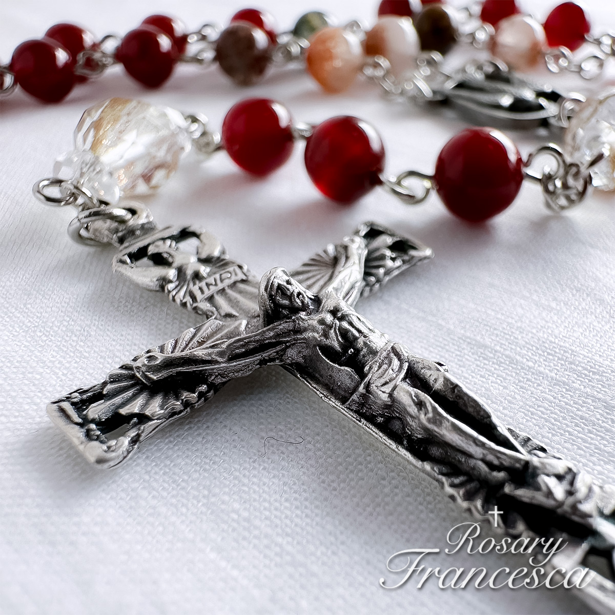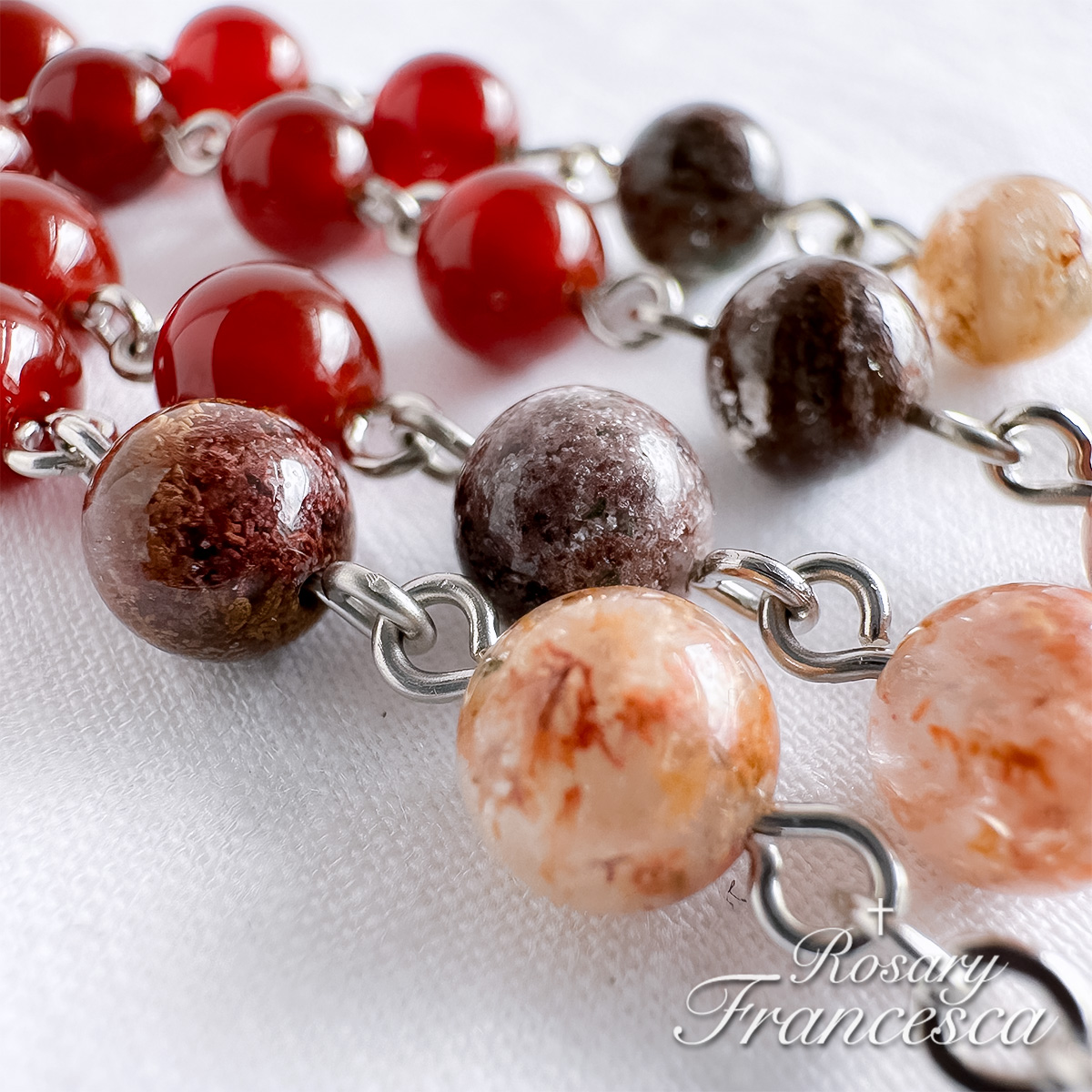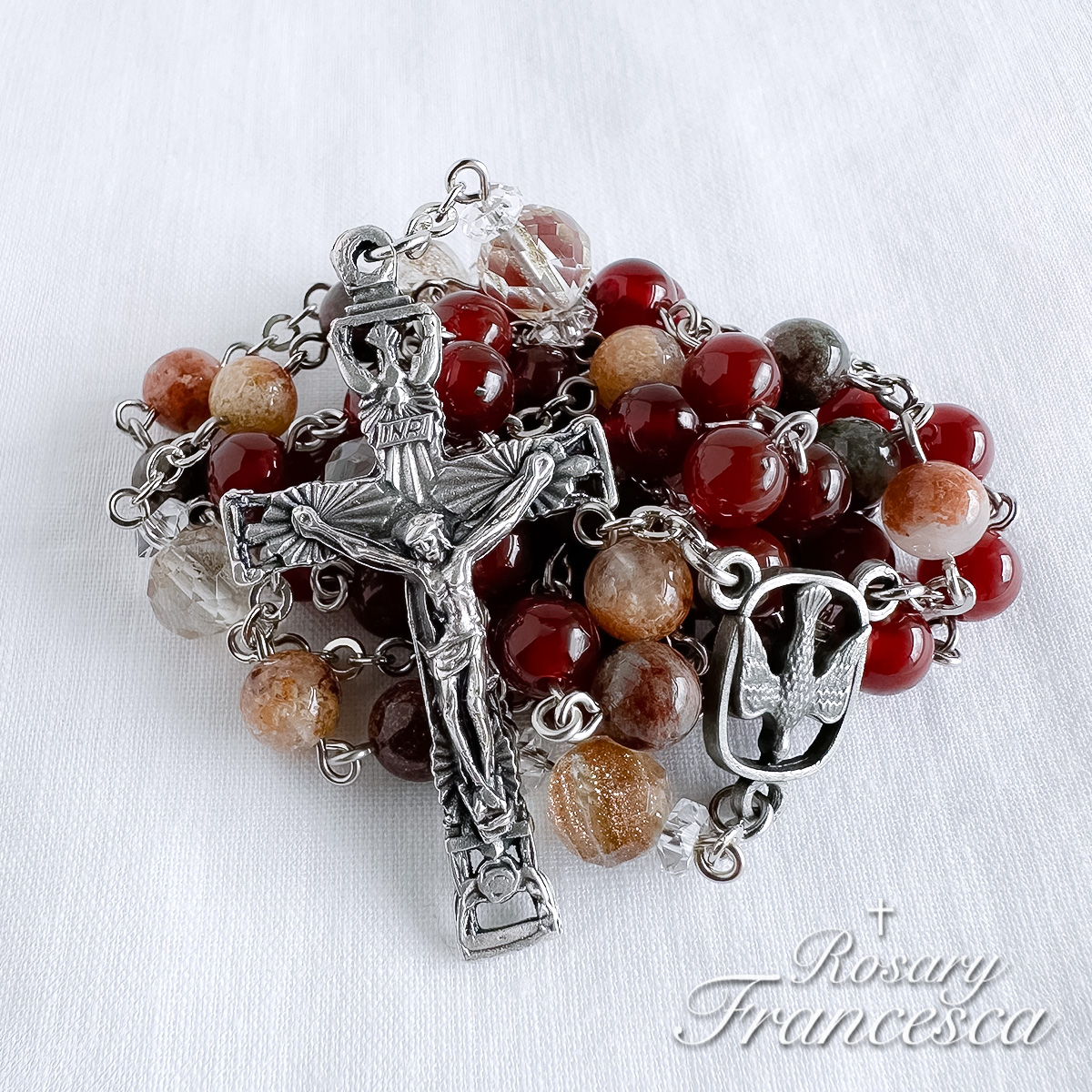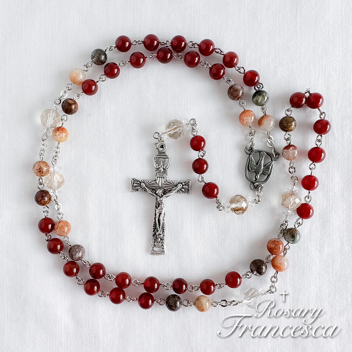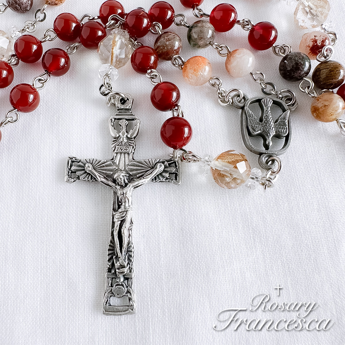 Deep red agate forms the base of this rosary, symbolising the fire of the Holy Spirit.