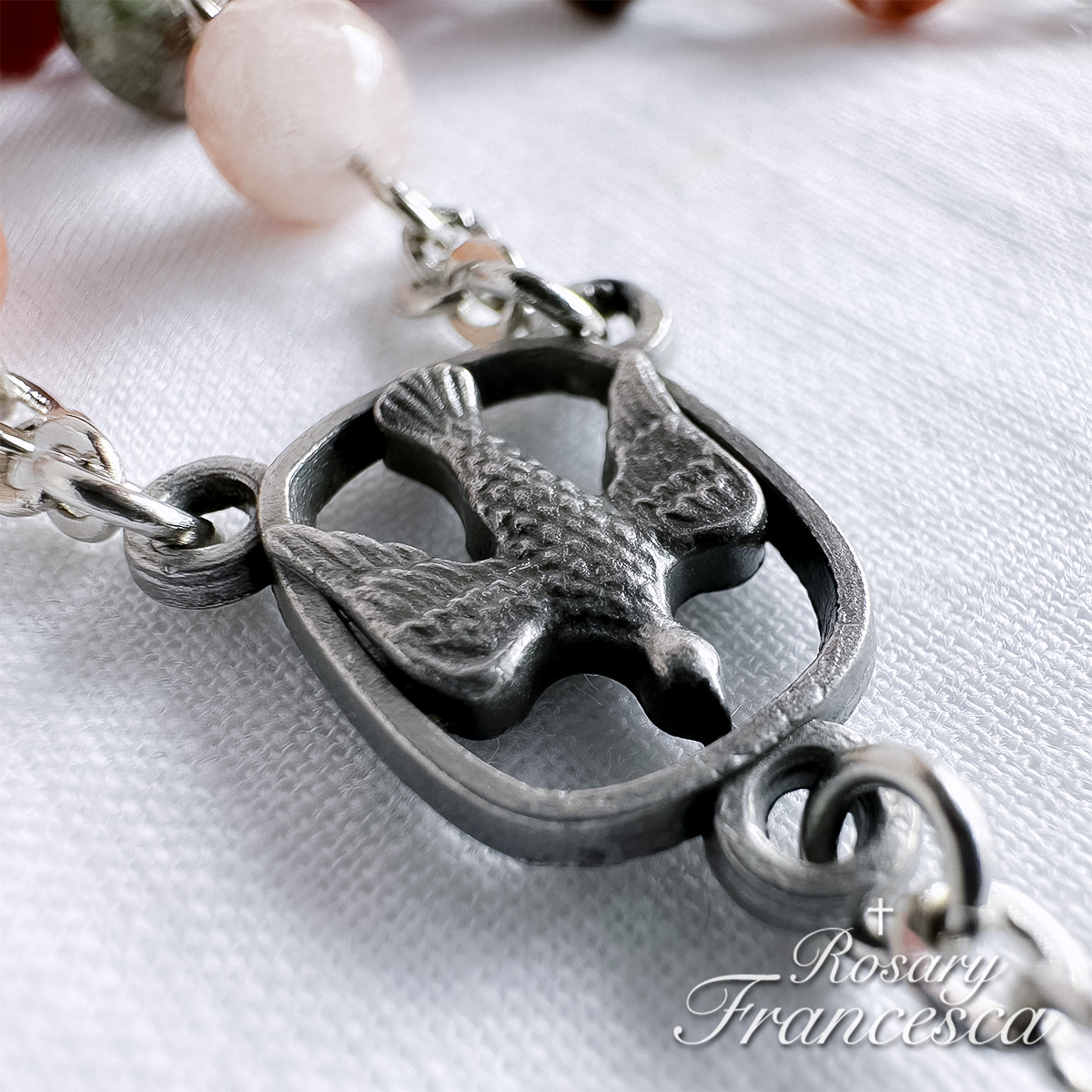 For the Lord’s Prayer bead, a faceted crystal with copper tones was chosen — a small reflection of the radiance and joy of Pentecost.