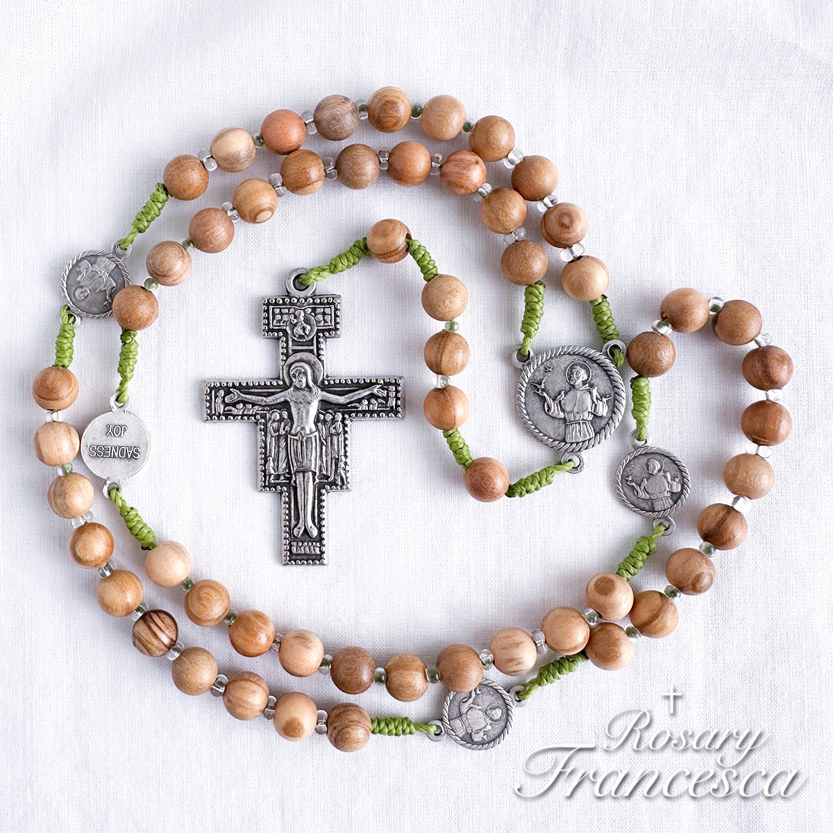 A rosary made with olive wood from Assisi and parts engraved with the Prayer for Peace.